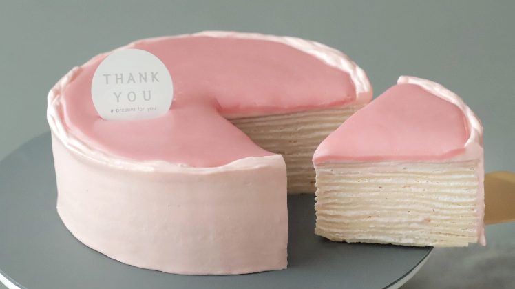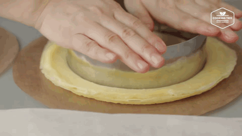 取6寸大小慕斯圈裁剪,不需要一张一张裁剪,将千层皮整齐叠起来,裁剪。也可以不裁剪。