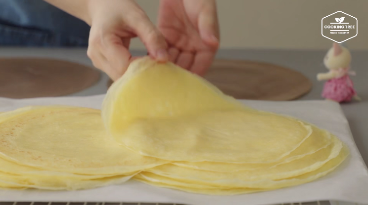 煎好的千层皮放在垫有烘焙纸的烤架上冷却,重复步骤。煎好的千层皮冷却备用。