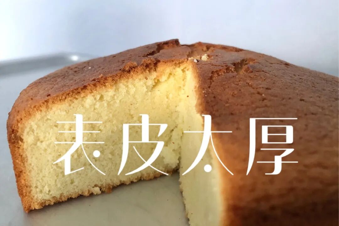 蛋糕出炉后,表皮过干过硬过厚,厚度约为3~5毫米左右,这就是蛋糕表皮太厚现象。(正常蛋糕表皮为1毫米左右)。