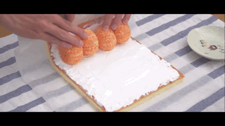 ▲模具铺一张烘焙纸,然后倒入抹平,震几下,放入预热170度烤箱,烘烤25分钟左右,具体看上色情况,烤完冷却备用。烤箱选用的尺寸为25X32CM,主要是橘子大,需要蛋糕长一些,用28X28CM的模具也可以,那橘子就要选小一些。▲蛋糕胚裁剪四边,上色一面朝上,取打发至抹面状态的奶油均匀抹上;▲将剥好皮的蜜桔排列放在一端,然后卷起这一端,蛋糕卷刚好闭合。好啦我们放入冰箱冷藏定型。最好先不抹奶油排练一下,如果有多余就用刀切掉。这里蜜桔选的有点大,如果选小一点的那种橘子,可以将蛋糕片切成两半做成两条。为了精致好看一些,可以在蛋糕卷上挤一些奶油裱花,用剥皮的橘子做装饰。这款蛋糕卷尽量不要用薄的蛋糕片,厚一点不仅口感好,不至于全是橘子的味道哦!看,材料简单,也不用多少奶油,又可以卖高一点价格呢!【课程推荐】