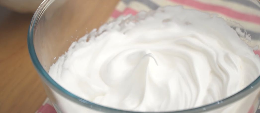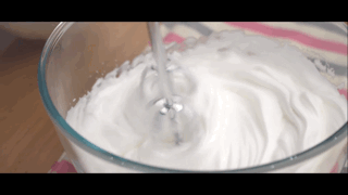 ▲放入一小撮盐,然后过筛入低筋面粉,充分搅拌、混合均匀。▲接下来打发蛋清。倒入几滴柠檬汁,砂糖分三次倒入打发;▲直到蛋霜呈现清晰纹路,拉起打蛋器有尖钩并有小小回落;▲再把混合均匀的蛋糊倒回蛋霜里,用翻拌的手法将其翻卷均匀。