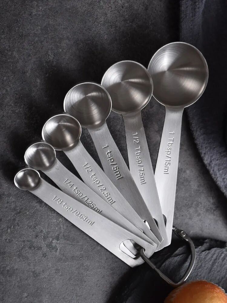 按容积称量的液体用量杯,极少用量的粉类和液体可以用量匙称量。量匙常用的一般有四个规格:一大匙或叫一汤匙(15ml)、一小匙或叫一茶匙(5ml)、1/2小匙(2.5ml)、1/4小匙(1.25ml),量取时如果是粉类,按一满匙并刮去多余的冒尖部分为准。