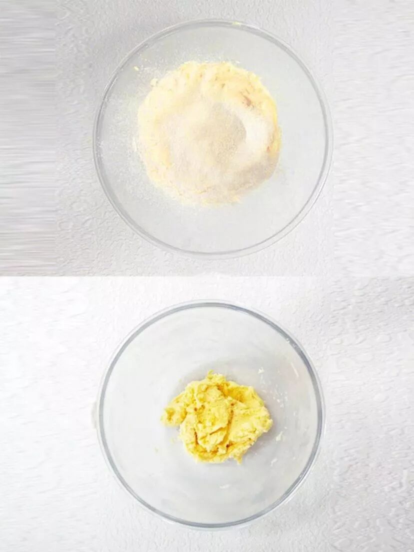 1、黄油自然软化后加入40克的糖粉先用刮刀拌均匀;