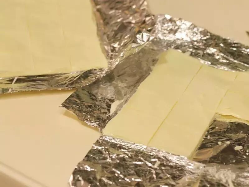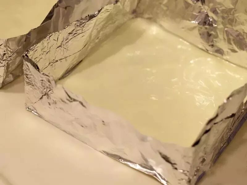 2、将小盘子里铺张铝箔纸,巧克力馅倒一小部分到小盘子里,用小号抹平刀抹平表面,倒入的量不要多,薄薄一层即可,放入冷藏冰箱两分钟样子凝固即可,不要冻硬);