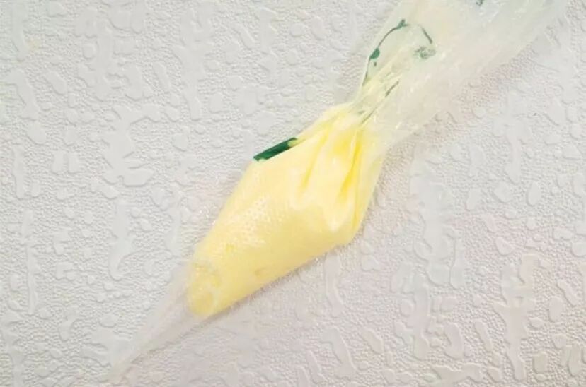 9、面糊装裱花袋里,裱花袋剪个小口,在瓦片模具的小格子里挤一小团面糊;