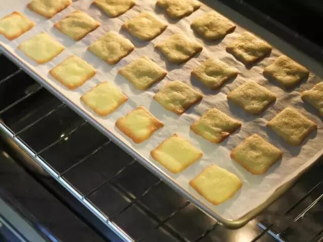 12、将烤盘放到烤箱中层,上火180度,下火160度烤9分钟左右,直到饼干的四边出现金黄色即可出炉,出炉后把硅胶垫从烤盘里提出来放桌上,用抹刀把饼干轻轻从硅胶垫上移除,再把硅胶垫上放瓦片酥继续同样的方法把剩下的面糊烤完。