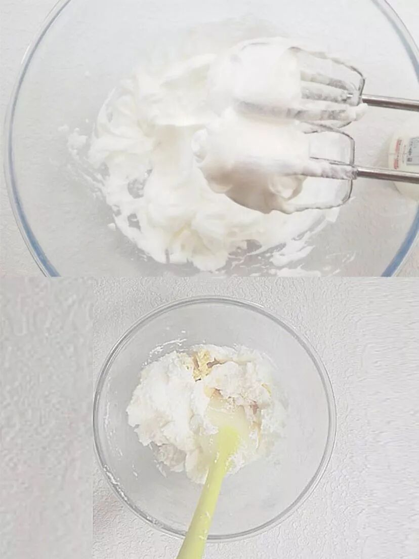 6、将打发好的蛋白取二分之一加到第4步拌好的面糊里用硅胶刮刀翻拌均匀;