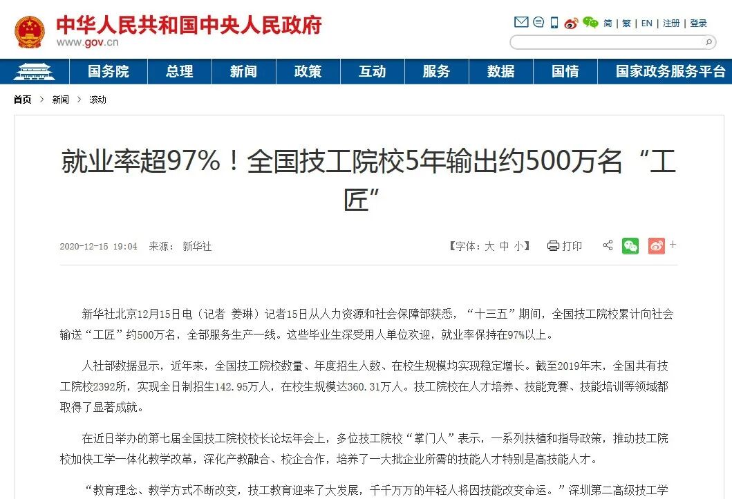 人力资源和社会保障部更有数据显示:全国技工院校5年累计向社会输送“工匠”约500万名,全部服务生产一线。技工院校毕业生深受用人单位欢迎,就业率保持在97%以上!