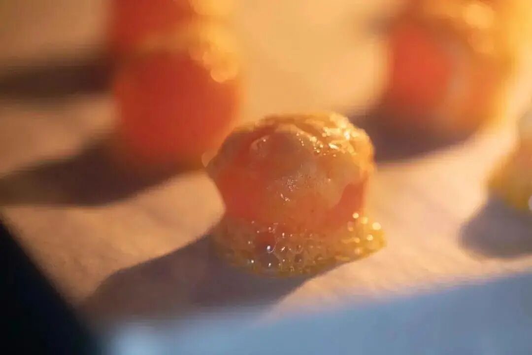 咸蛋黄表面喷洒少许高度白酒,送入烤箱中层,上下火160度烘烤10~15分钟,烤至充分冒油即可出炉待用。