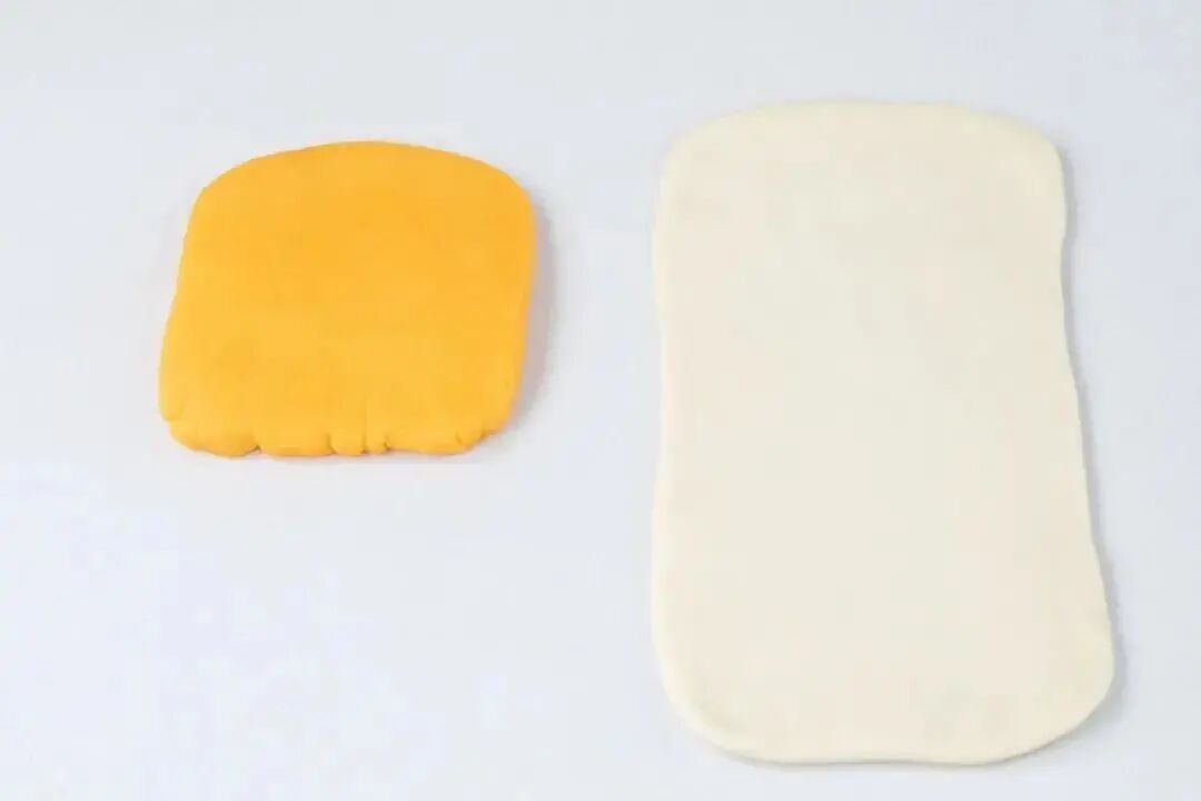 将水油皮擀开成一个边长约30cm*15cm长方形,然后把油酥面团擀到水油皮片的一半大小。