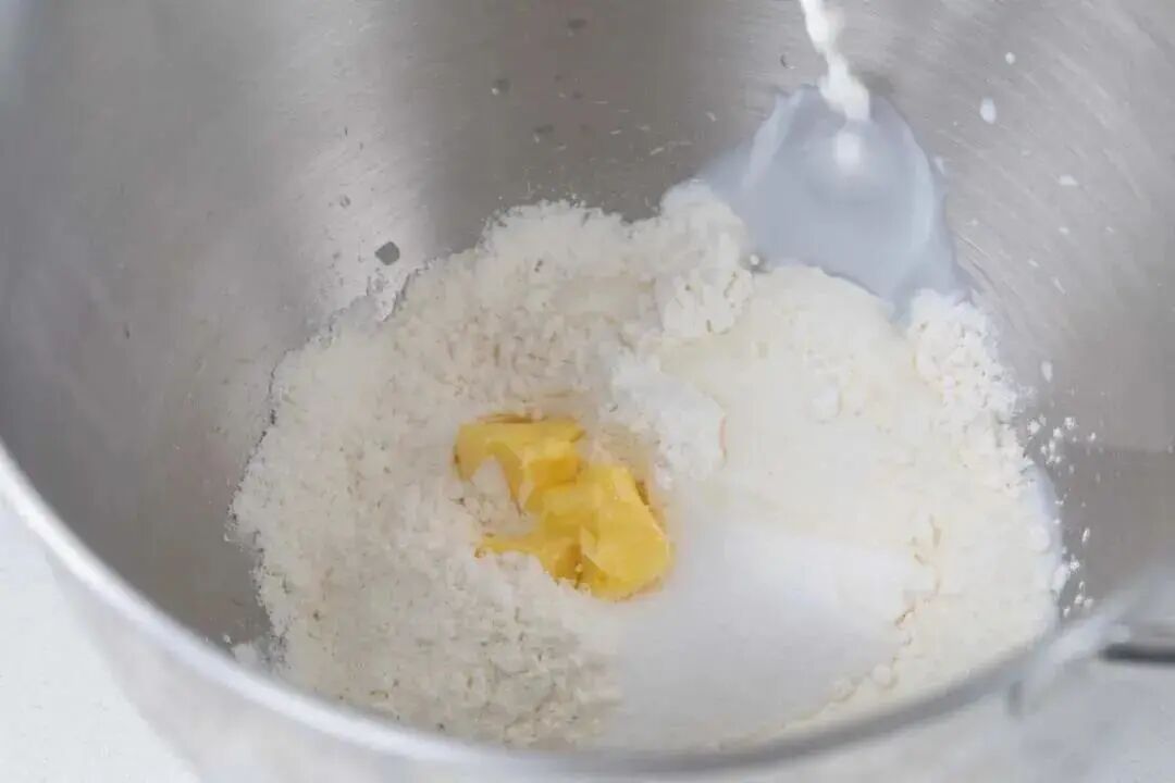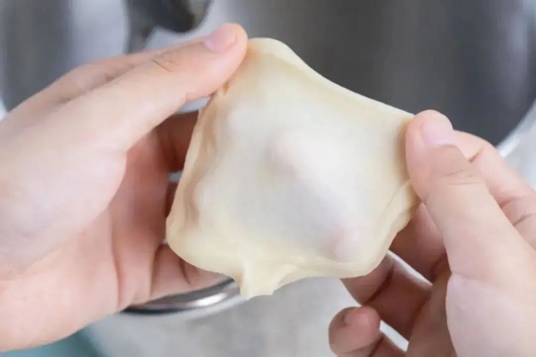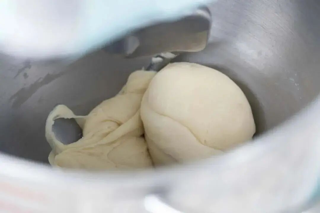 将水油皮所有材料放入厨师机桶内,开启中速搅打成团,揉至能扯出薄膜的状态,后续操作才不容易破皮。