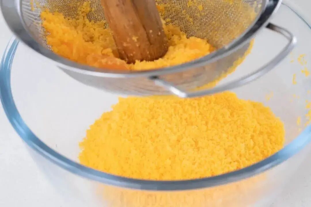 借助网筛和擀面杖,将烤好的咸蛋黄按压过筛成细腻的咸蛋黄泥。