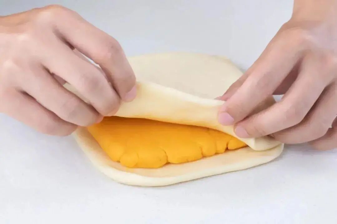 折起水油皮片包裹住油酥面团,捏紧边缘收口处。