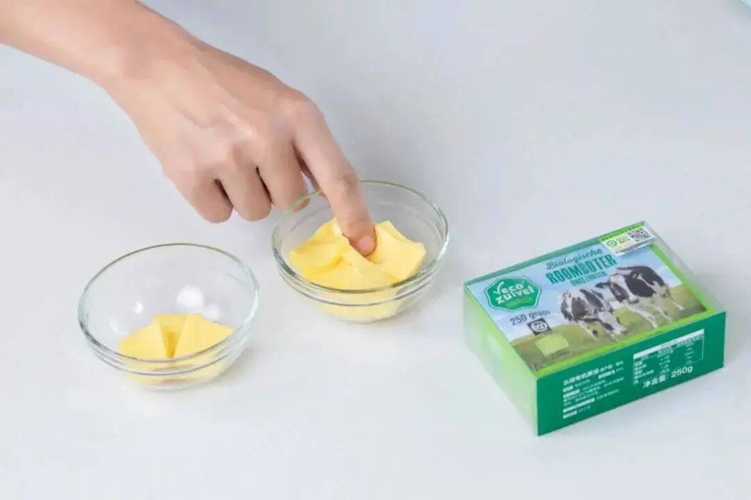 准备两份黄油,分别是35g和60g,切成小块,室温软化至用手可以轻轻戳个小洞的状态。