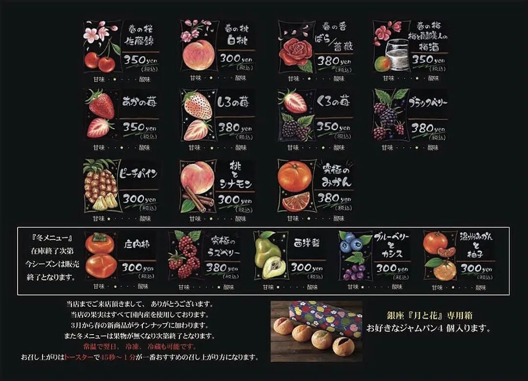 店铺内的产品不管任何季节都保证有11种口味的果酱面包。会根据季节变化而选用当季日本各地最优质的水果作为原材料,制成果酱加入面包中。