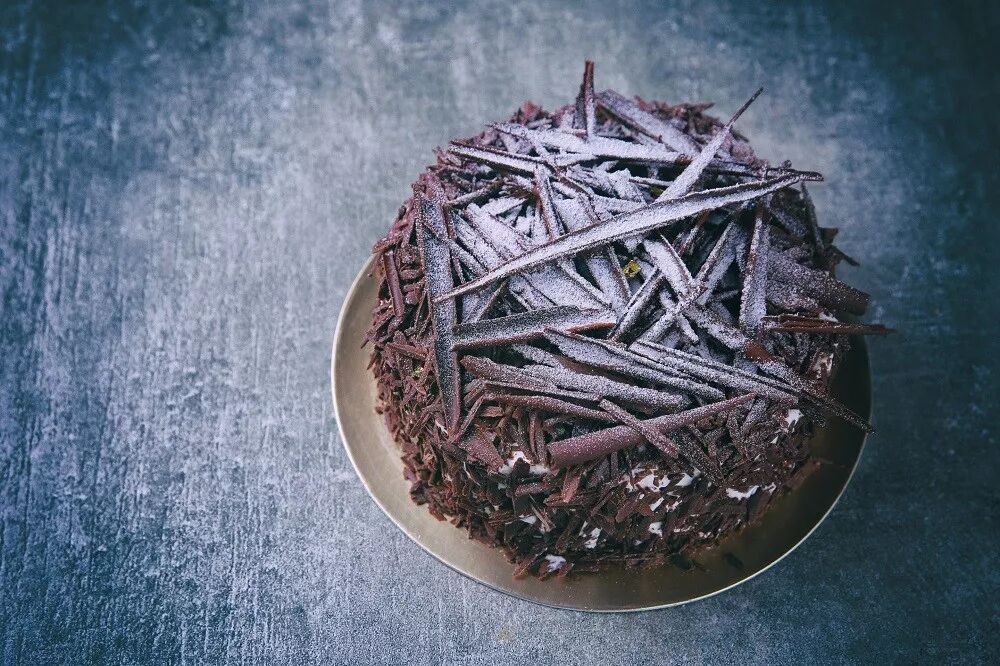 喷洒前,要让蛋糕急冻,使表面温度下降。当巧克力和可可脂混合物喷上去之后,会迅速凝结成细小的颗粒。不停喷洒至覆盖整个面后,呈现一层绒面的效果,层次感鲜明,整体效果比筛粉更加梦幻。