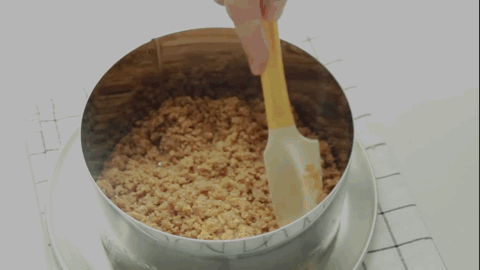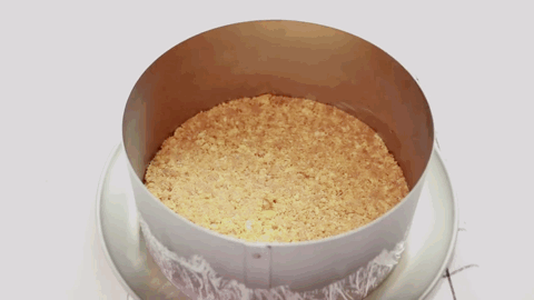 将饼干碾碎,加入已融化的无盐黄油拌匀,之后再倒入6寸的加高模具压平,送入冰箱冷冻。