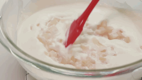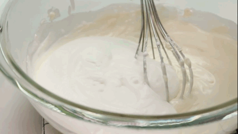 这时就可以倒入吉利丁液了,边搅拌边倒,直到它们完全融合。