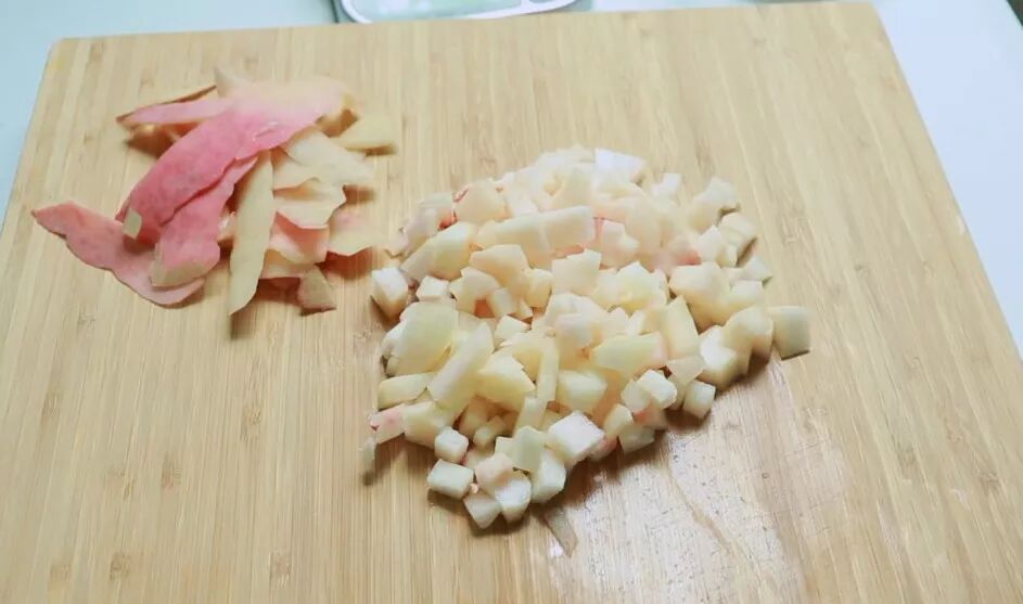 先将一个蜜桃洗净,削皮之后把蜜桃果肉切成丁,切记桃子皮勿丢!