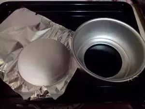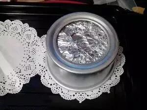 10. 将锡纸打开,把里面的蛋糕模具底片拿出来。