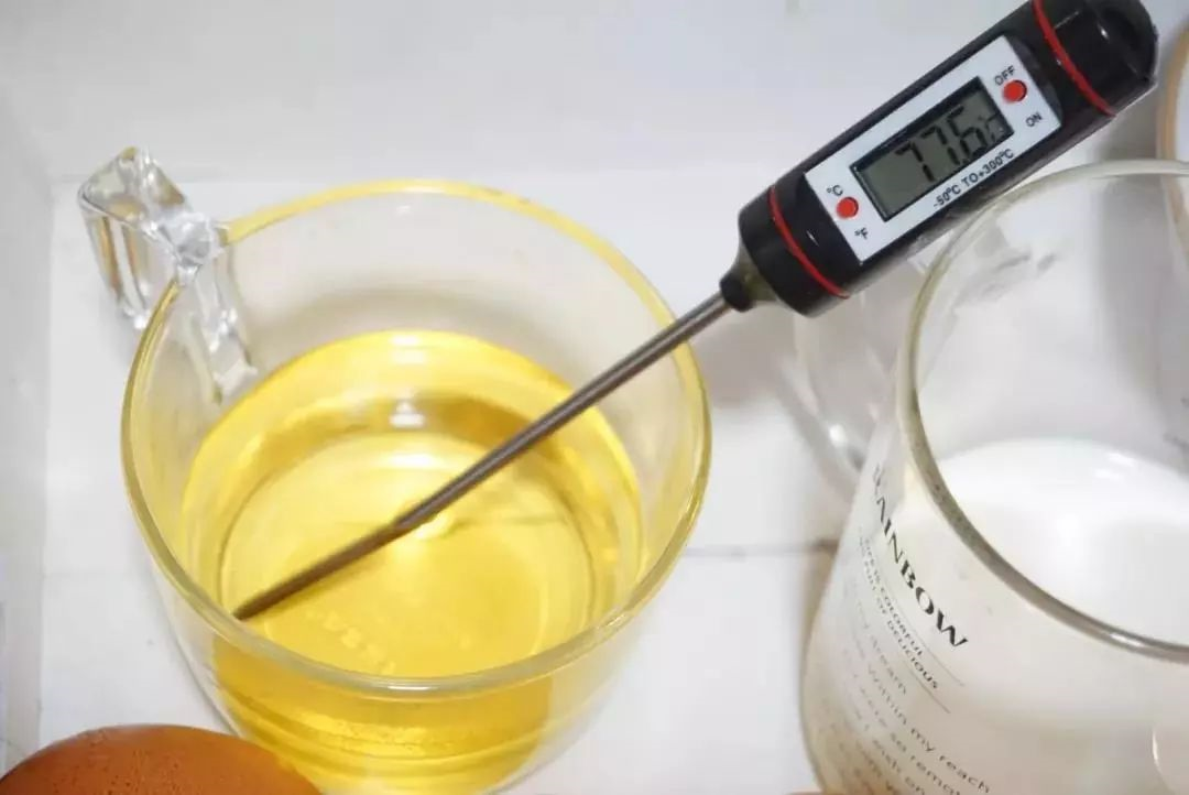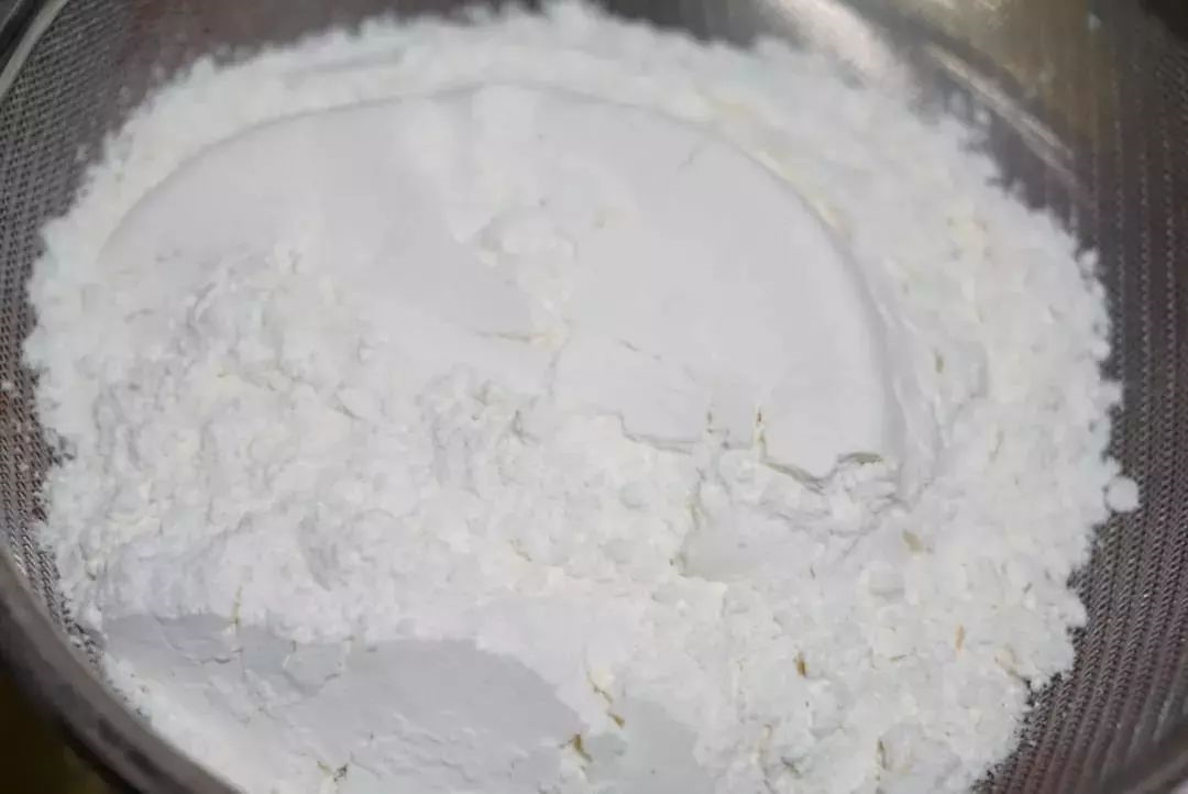 玉米油放入容器内,微波炉高火加热,温度在80度以内,想做好,一定要用测温度的机器控温,将油倒入盆中,筛入低筋面粉。