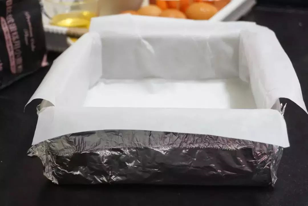 准备食材,将11寸加高方形蛋糕模具外面包裹锡纸,这样做不仅是为了防水,更是为了防止蛋糕侧面上色,包3层更佳。