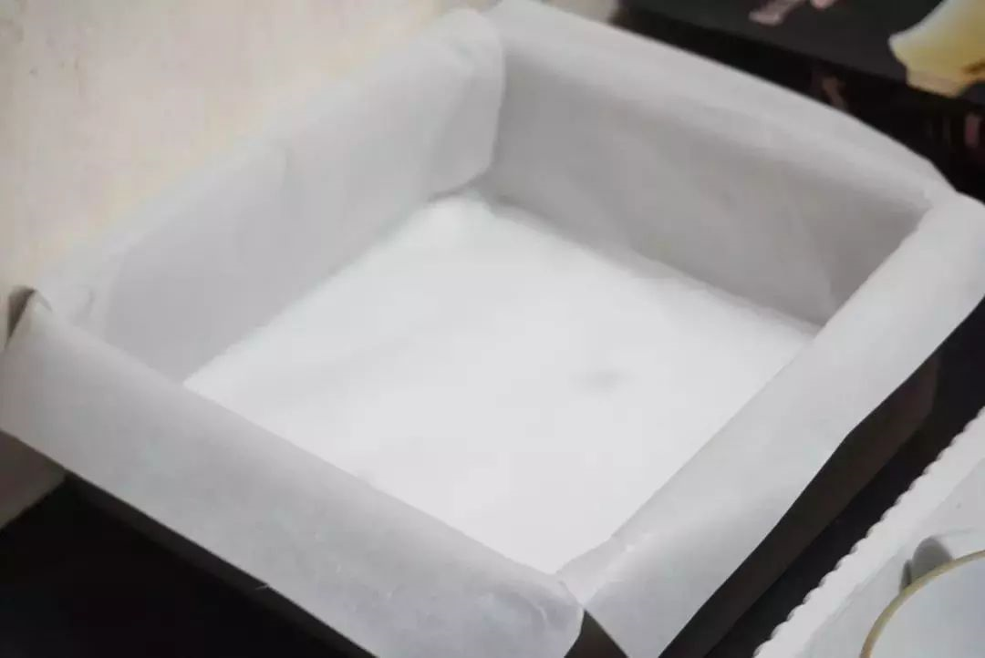 然后将烘焙油纸垫在模具内,这样方便取出蛋糕,因为成品很软嫩。