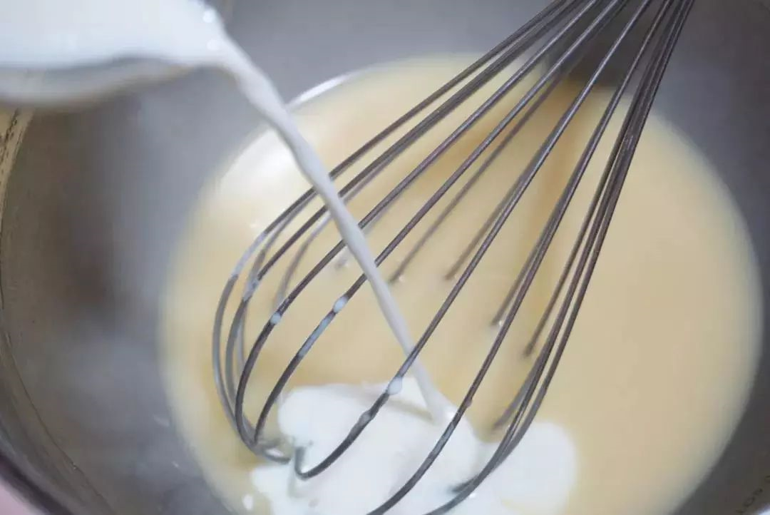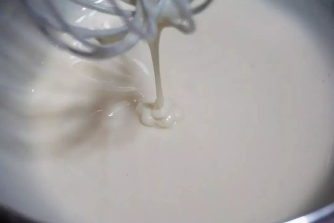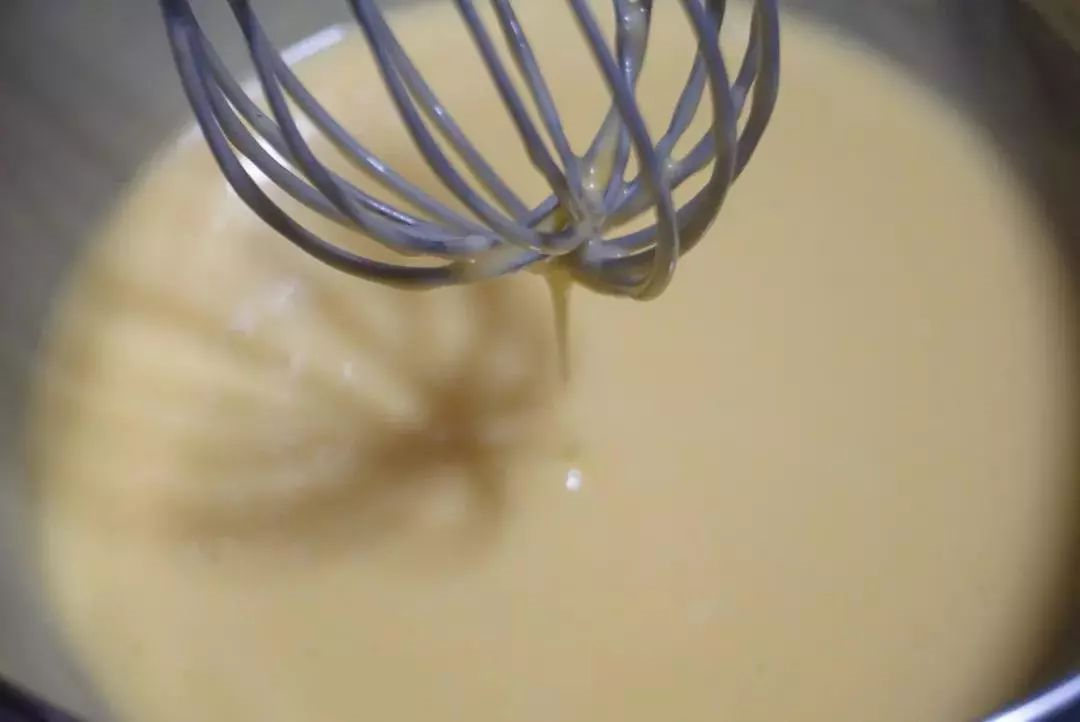 使用手动打蛋器拌匀,拌匀到表面有一定的纹路即可,然后再加入牛奶继续拌匀。