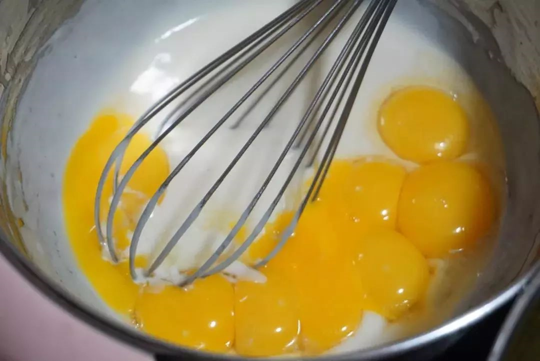拌匀到这样的状态后,加入鸡蛋黄,蛋清放入另一个无水无油的盆中备用。