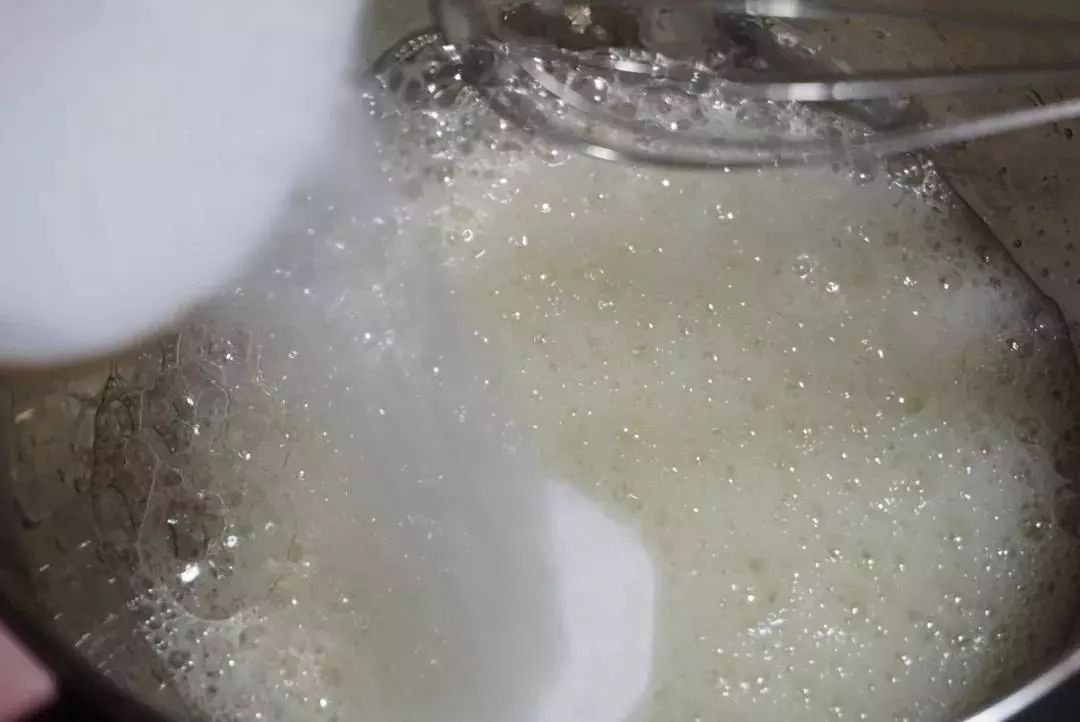 加入蛋黄后拌匀到如上图的状态,烤箱150度预热起来,蛋清在无水无油的盆中,我们使用手动打蛋器或厨师机打发。