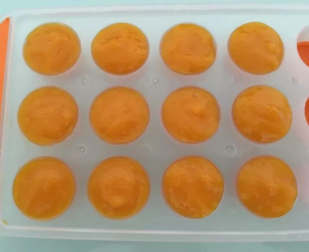 5. 用裱花袋装大约100g的芒果泥,挤进冰格中放入冰箱冷冻做成流心,芒果泥的高度不能超过模具高;