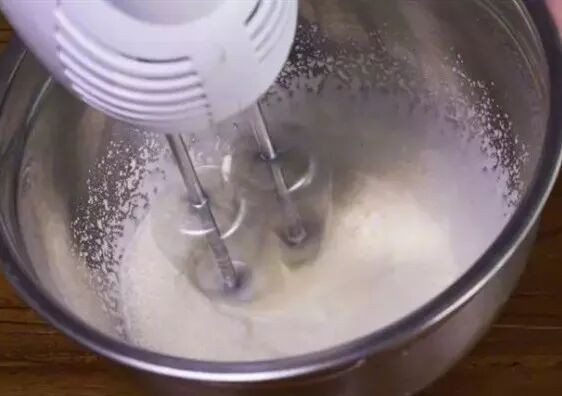 7. 淡奶油用电动打蛋器打发至略微浓稠的状态,打发的淡奶油倒入芒果泥中搅拌均匀;