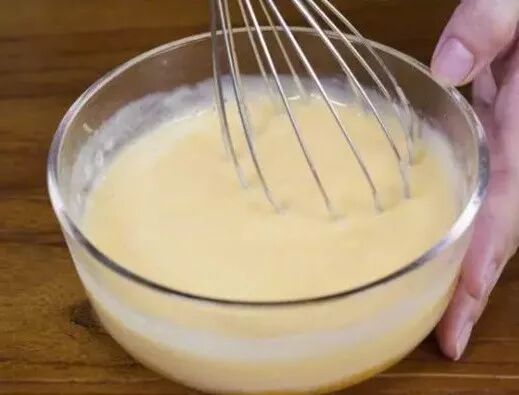 6. 牛奶加热后,加入泡软的吉利丁片搅拌,直至吉利丁片完全融化,将混合液分多次加入芒果泥中,搅拌均匀;