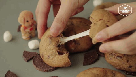 ok,香香的红棕色曲奇出炉!!轻轻掰开,雪白的棉花糖成拉丝状被扯开!