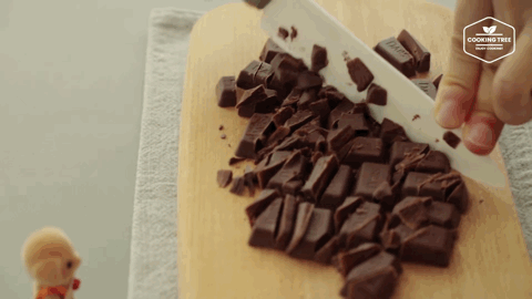 接下来将黑巧克力切碎,可以选择56%的可可含量,喜欢苦一点可选择56%以上,因为这个配方的糖量相对多一些,所以不要用牛奶巧克力,不然太甜了。