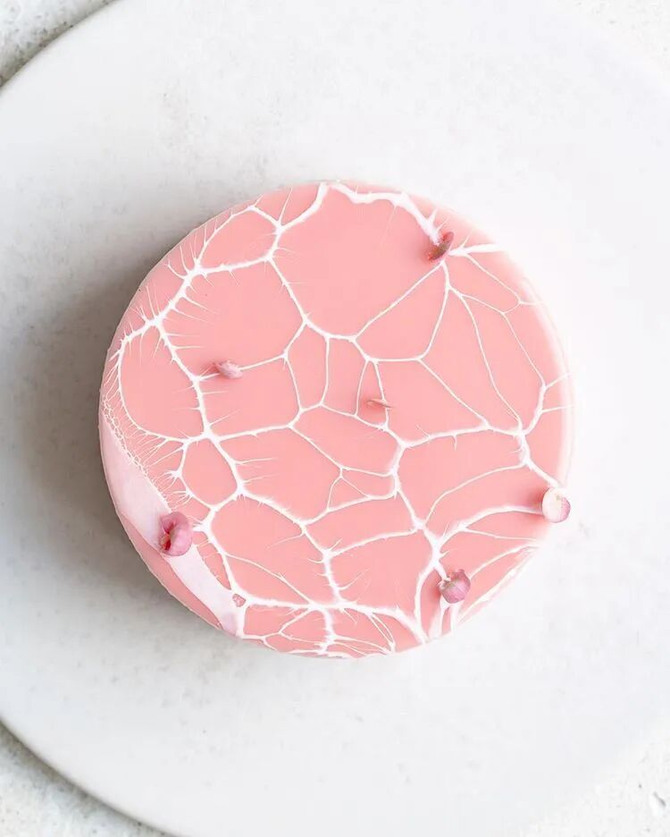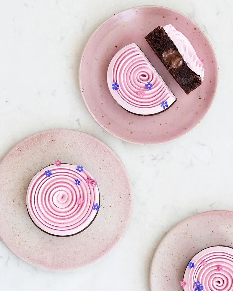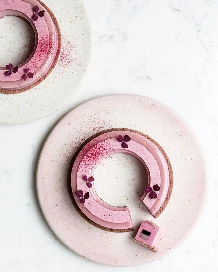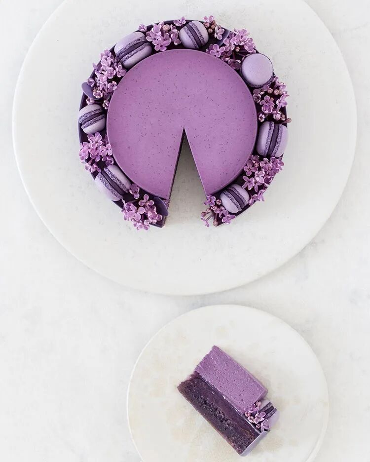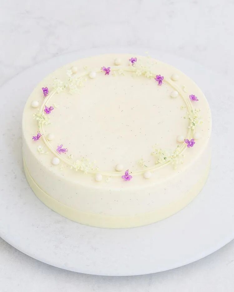 可以使用极简自然的裱花线条或是点缀巧克力豆、花瓣等在蛋糕表面上。还可以将蛋糕整体留白,在四周装点马卡龙、鲜花、水果、巧克力等,如同花环一般!