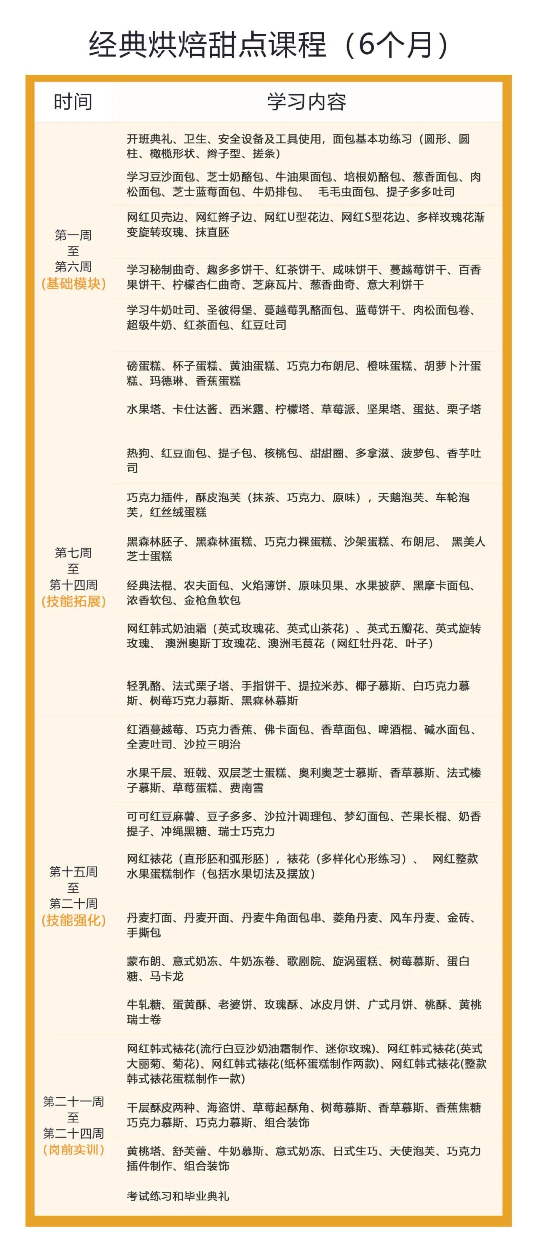 培养目标:以培养精通西点制作,懂经营、善管理,熟练掌握各种西点制作方法以及相关知识储备的人才为目标,并为有创业想法的学子,提供创业帮扶。