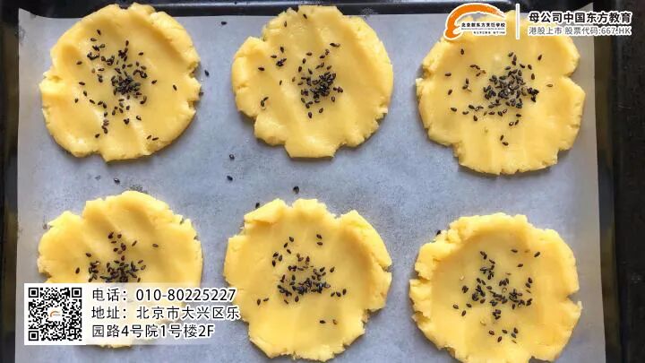4、面团分成30g左右的小面团,放在铺好油纸的托盘上,按扁,撒上黑芝麻,入烤箱160度20分钟即可;