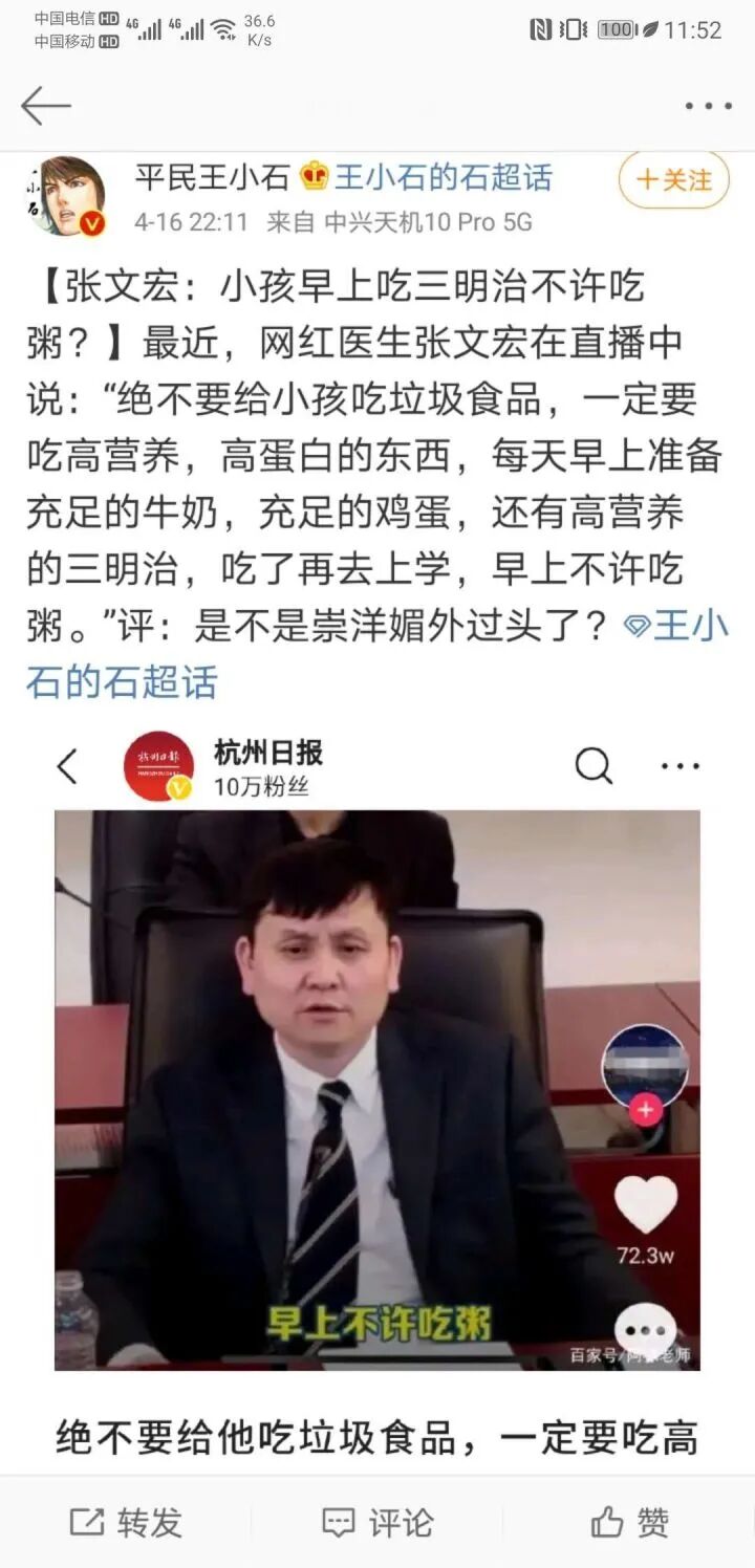 某著名军事大V,抓住张文宏教授直播时说的一句话“不许吃粥”不放,大作文章,一时间成为舆论焦点: