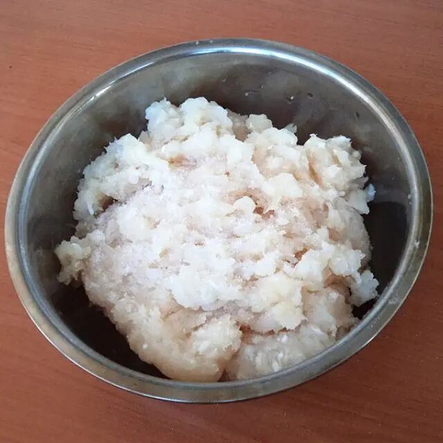 2、将鱼柳剁碎加盐