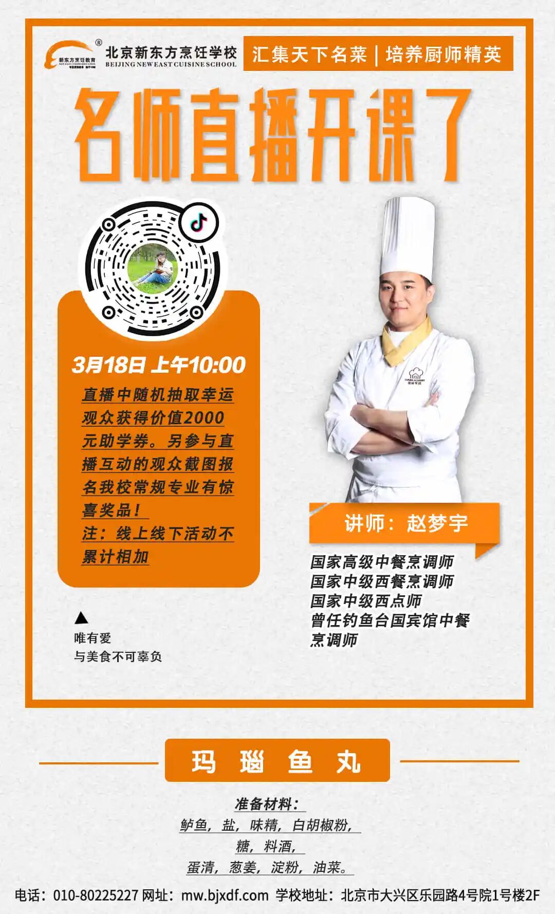 3月18日上午10:00,在我们北京新东方烹饪大兴校区的直播间,将会由国家高级中餐烹调师、国家中级西餐烹调师、国家中级西点师赵梦宇老师,在直播中教大家如何制作玛瑙鱼丸!