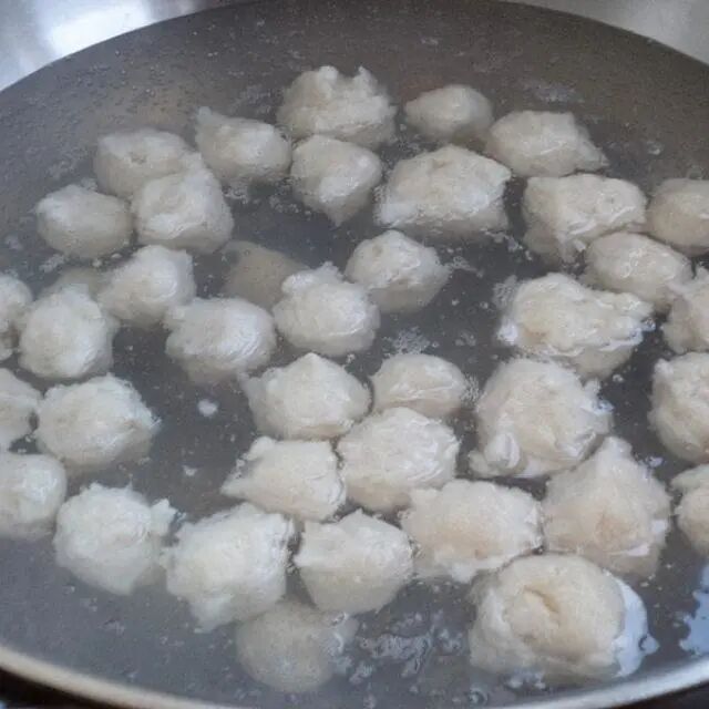 8、煮锅加水烧至接近人体温,将鱼丸入锅煮至鱼丸浮起即可捞出