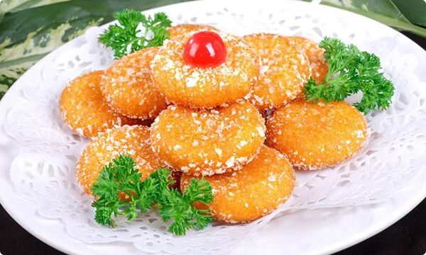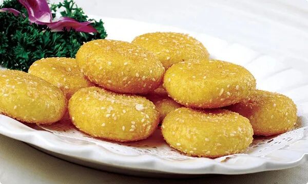 南瓜饼是一道传统菜式,主要是以南瓜、面粉以及糯米粉为原料做成的饼,各地的制作方法大不相同。其外观金黄,口味酥软甜糯、香味醇厚,润肺健脾,镇咳化痰。