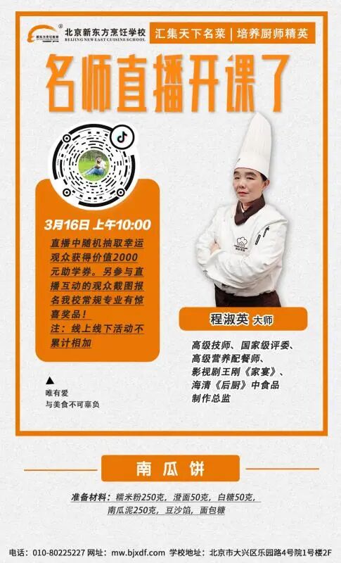 不过大家不要担心,在3月16日上午10:00高级技师、国家级评委、高级营养配餐师、影视剧王刚《家宴》、海清《后厨》中视频制作总监,程淑英老师将会在我们北京新东方烹饪大兴校区的直播间中,手把手的教大家如何制作南瓜饼!
