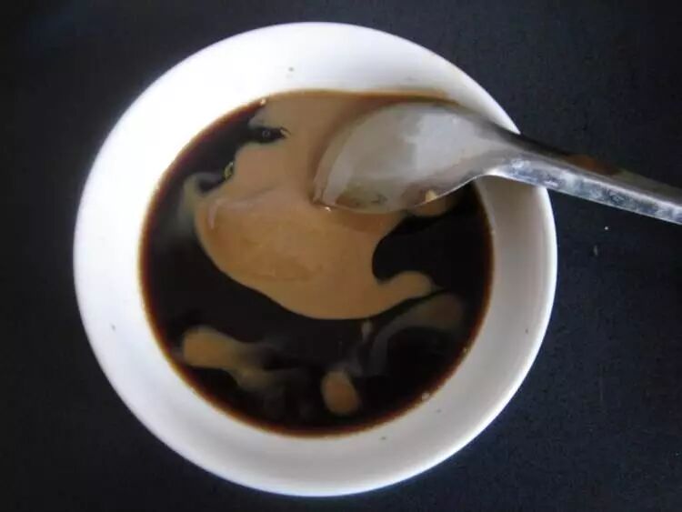 麻酱2汤勺盛入碗中,再用同样大小的汤勺称量陈醋,醋的量是麻酱的3倍,也就是6汤勺的陈醋。用醋来调麻酱,醋不要一次全部放入,要少量分次加入,每加入一次都要搅拌均匀以后再加入下一次。
